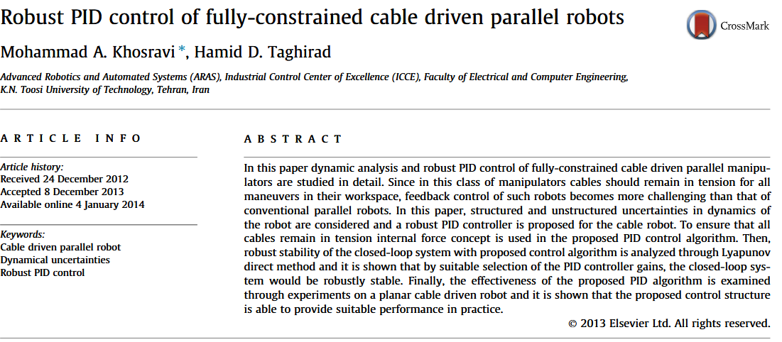 In this paper dynamic analysis and robust PID control of fully-constrained cable driven parallel manipu- lators are studied in detail.